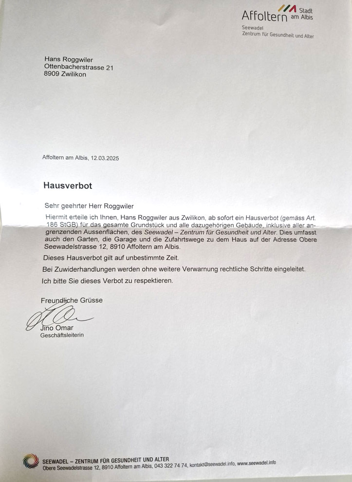 ich erwarte von Ihnen, dass Sie sich der Sache mich betreffend des mir im Seewadel grundlos erteilten Hausverbots annehmen. Ich möchte, dass die Heimleiterin mir stichhaltig begründen muss, weshalb sie dieses Verbot erteilt hat, ich möchte einen rekursfähigen Entscheid, den ich anfechten werde.